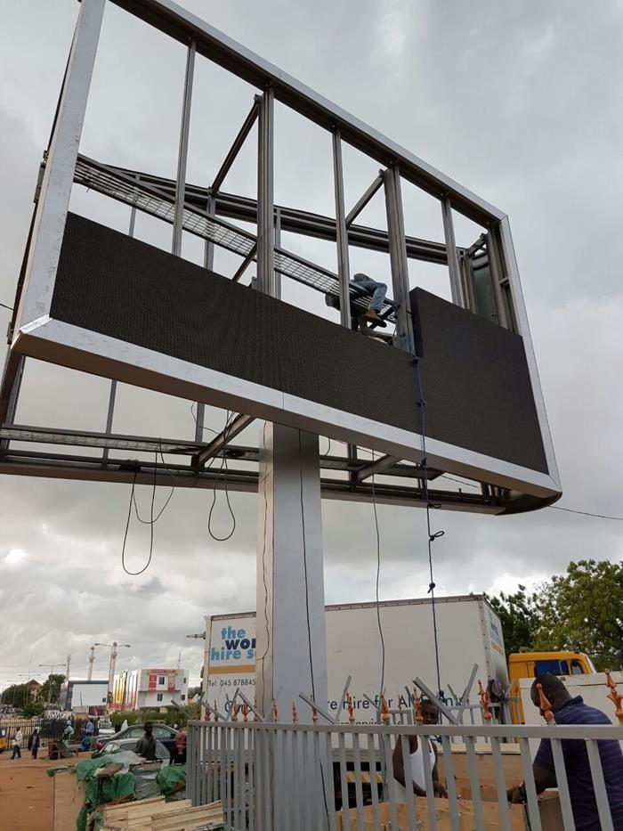 Οι ψηφιακές διαφημιστικές πινακίδες led διπλής όψεως μονόπολων υψηλής φωτεινότητας εξωτερικού χώρου P10mm μόλις εγκαταστάθηκαν στη Νιγηρία. Η οθόνη LED είναι κατασκευασμένη από αλουμινένιο αδιάβροχο πάνελ led 960x960mm. Καθώς η θερμοκρασία του καιρού είναι πολύ υψηλή στη Νιγηρία, χρησιμοποιήσαμε ντουλάπι αλουμινίου για καλύτερη ακτινοβολία θέρμανσης. Και χρησιμοποιήσαμε επίσης υψηλής ποιότητας ενθυλακωμένα χρυσό σύρμα LED DIP με τροφοδοτικά Meanwell για την οθόνη led, ώστε να μπορεί να λειτουργεί καλά χωρίς κλιματιστικά για ψύξη.